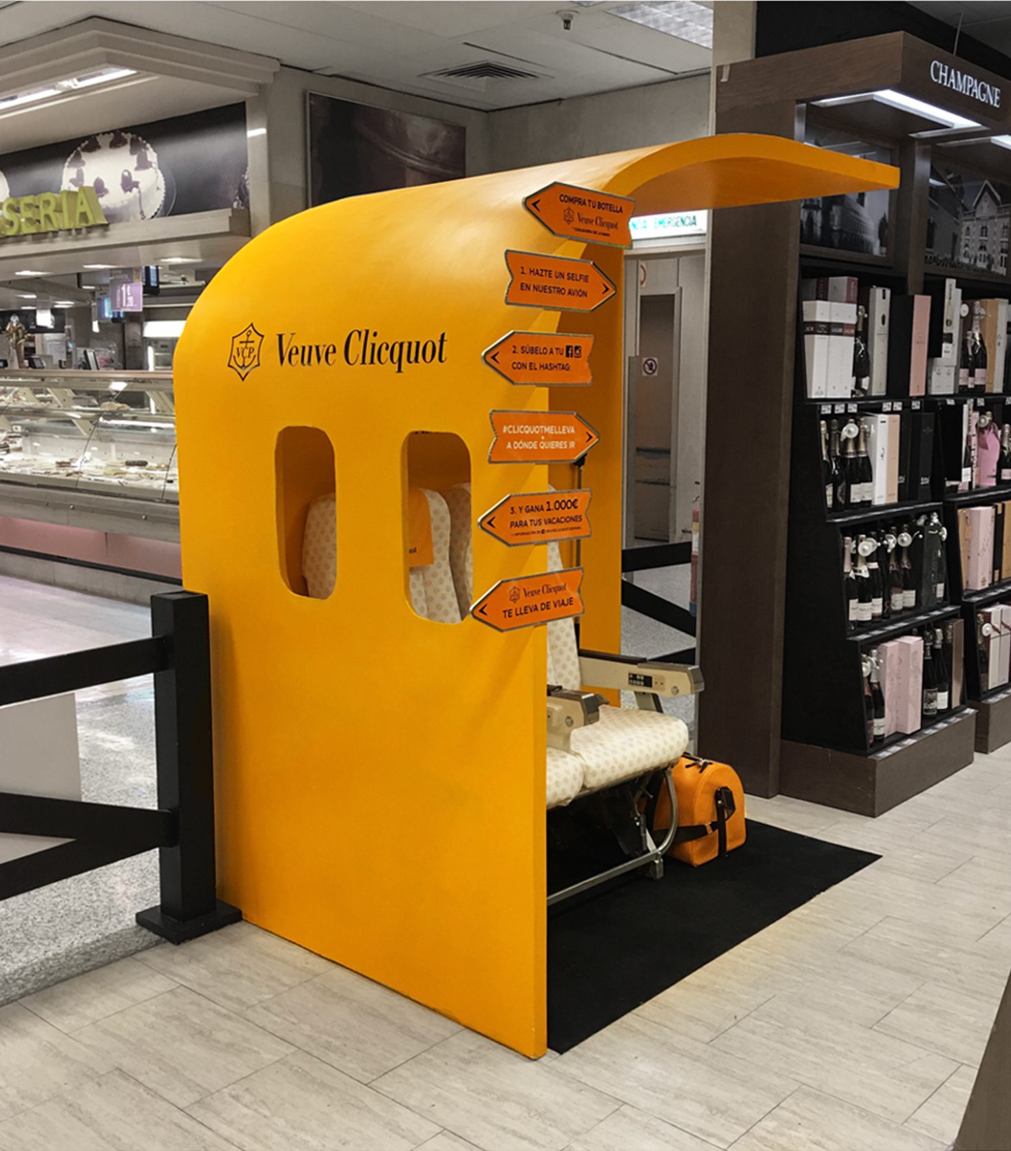 ¿Cómo? Propusimos una acción integrada con los grandes distribuidores de la marca (principalmente El Corte Inglés y Lavinia) consistente en un concurso online.  Para ello diseñamos, fabricamos e instalamos estructuras simulando aviones reales.  La dinámica, sencilla pero efectiva: Compra tu botella de Clicquot + hazte una foto en nuestro avión + súbela a tus redes sociales con el hashtag #clicquotmelleva y el lugar a donde te gustaría ir de vacaciones. Veuve Clicquot premió a los distintos ganadores con 1.000,00 € para ir de vacaciones al lugar indicado.
