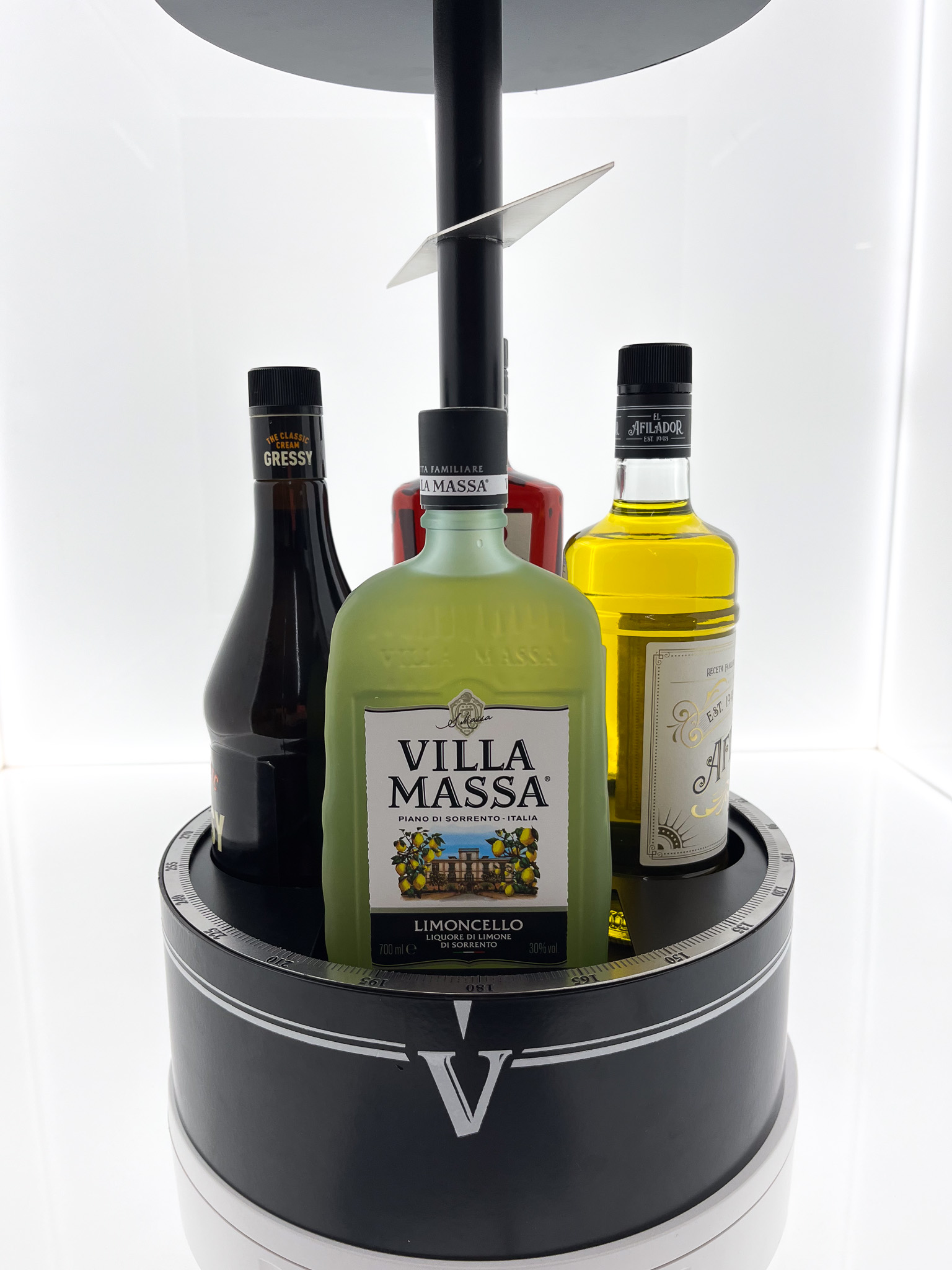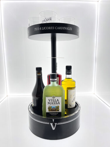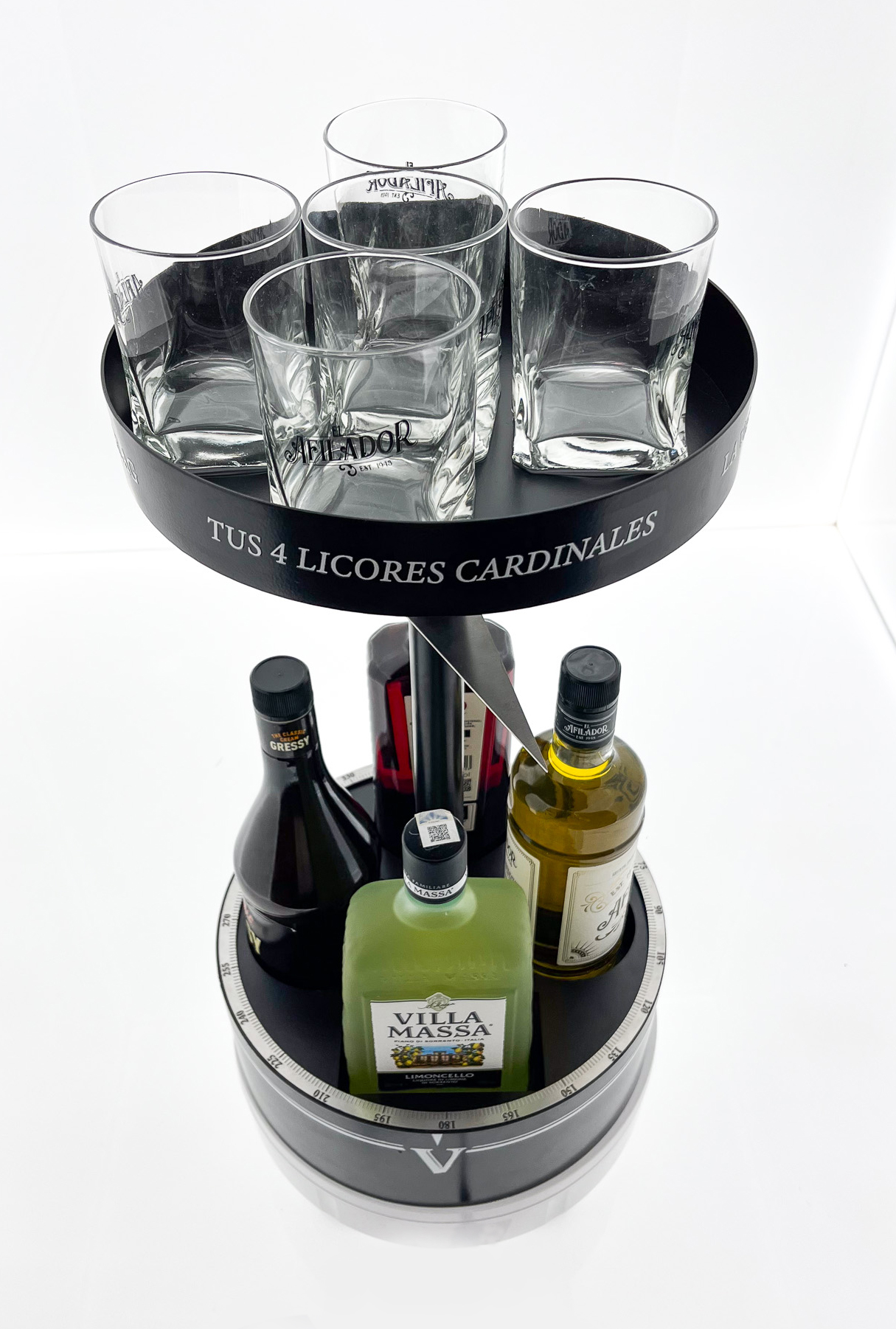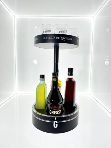 ¿Cómo? Creamos el concepto La Veleta de Zovielag para disfrutar de los cuatro chupitos cardinales. Es una pieza diseñada para la sobremesa cuando apetece un chupito, con esta pieza la azafata ofrece al consumidor probar alguno de los  4 digestivos de la casa Zamora Company y si este tiene dudas solo debe girar la veleta para que lo elija el azar.